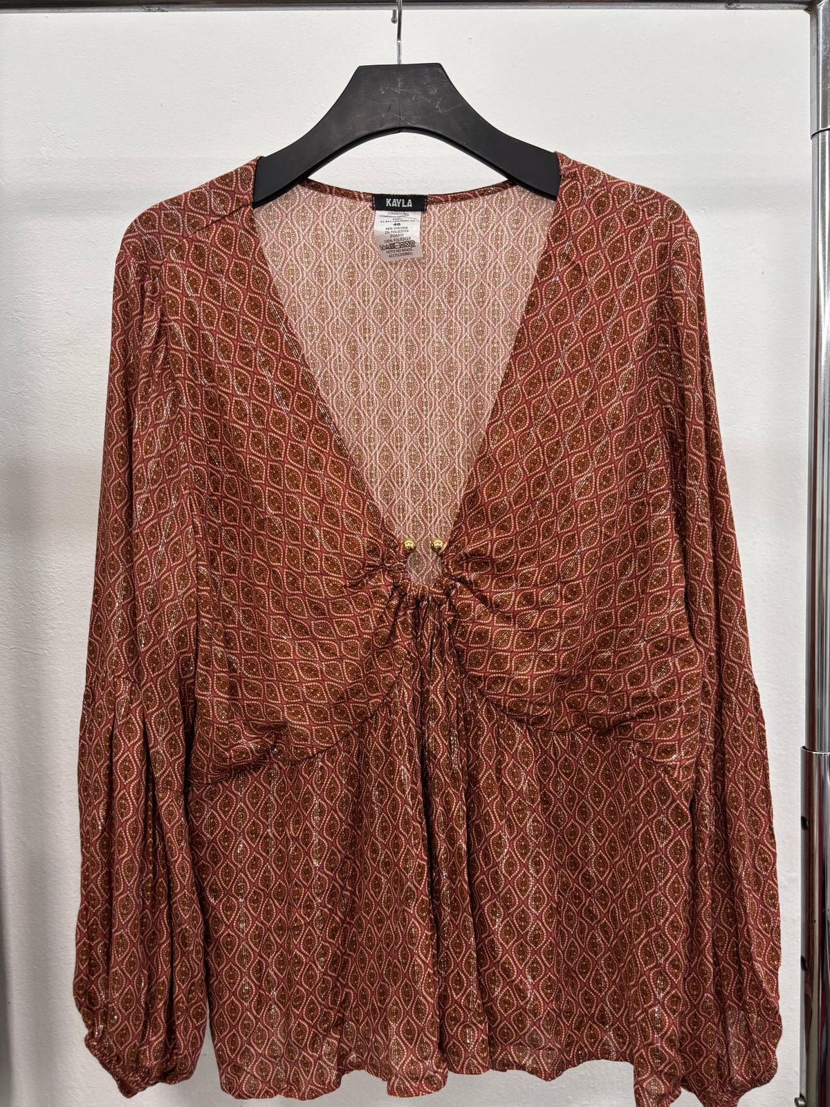 BLUSA EM TECIDO DE VISCOSE COM POLIÉSTER ESTAMPADO COM FIOS DE LURÉX DE CAIMENTO LEVE E FLUÍDO. POSSUI DETALHE DE AVIAMENTO CENTRAR NO BUSTO E RECORTE COM FRANZIDO. MANGA LONGA COM ELÁSTICO NO PUNHO. COM FORRO