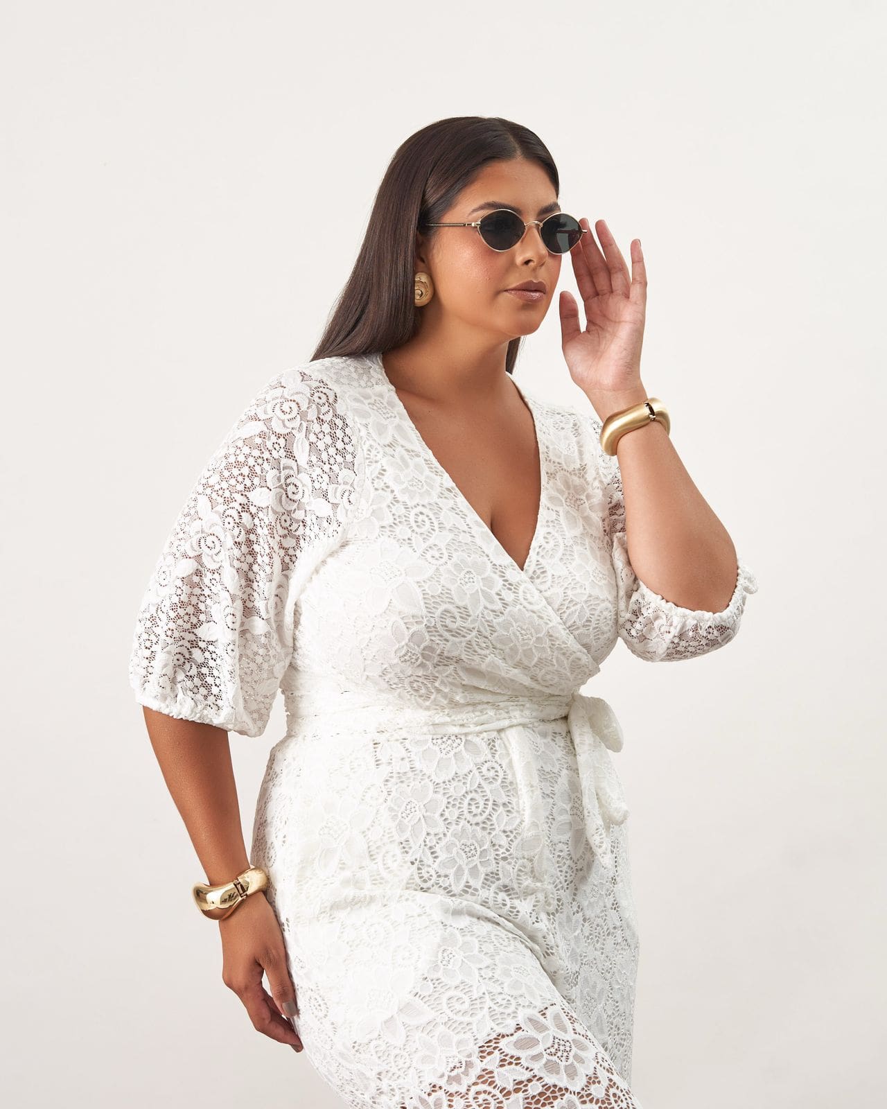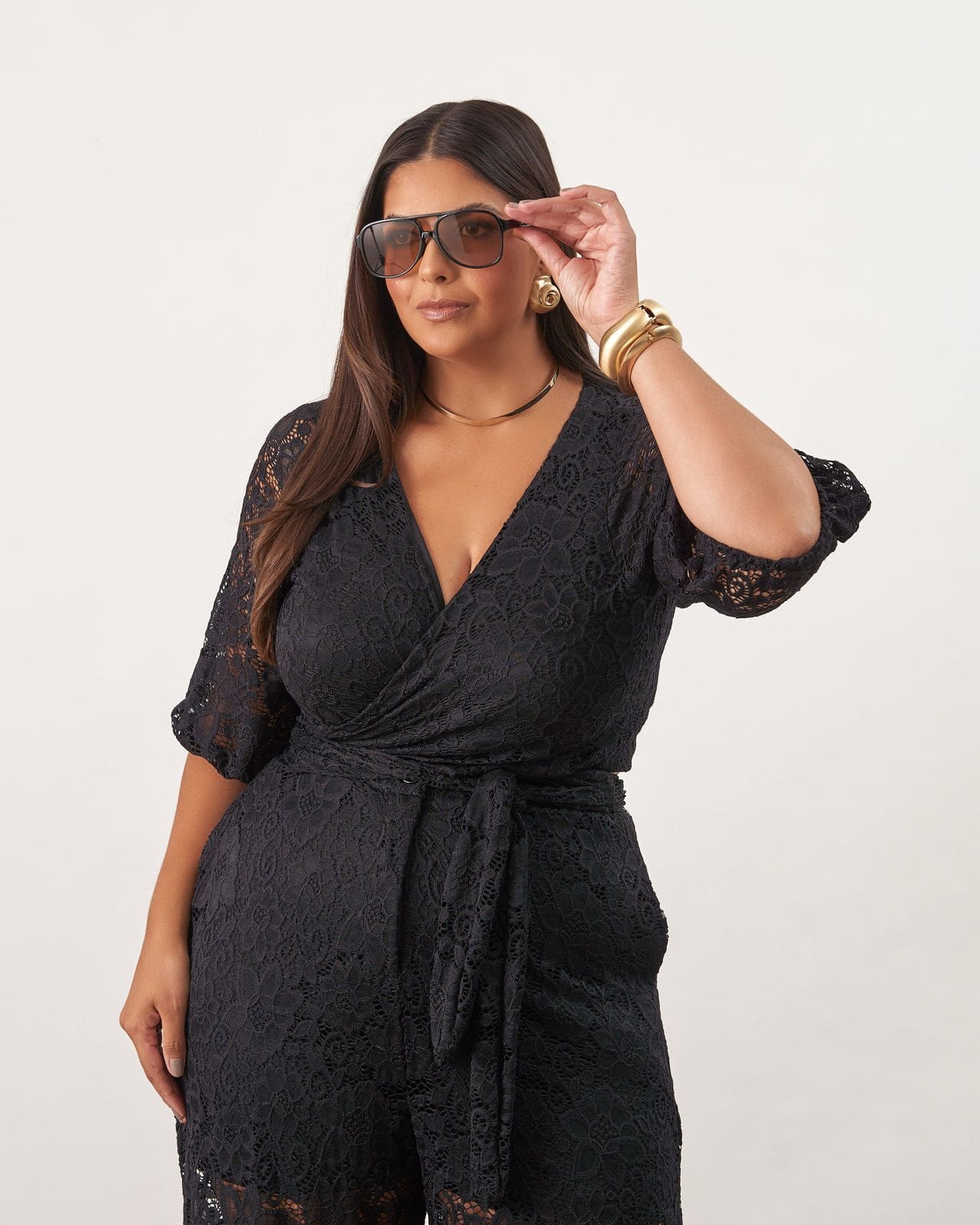 Blusa em renda de malha com traspasse frontal e amarração ao corpo. Possui mangas e elástico na barra 3/4