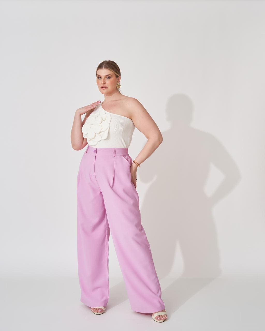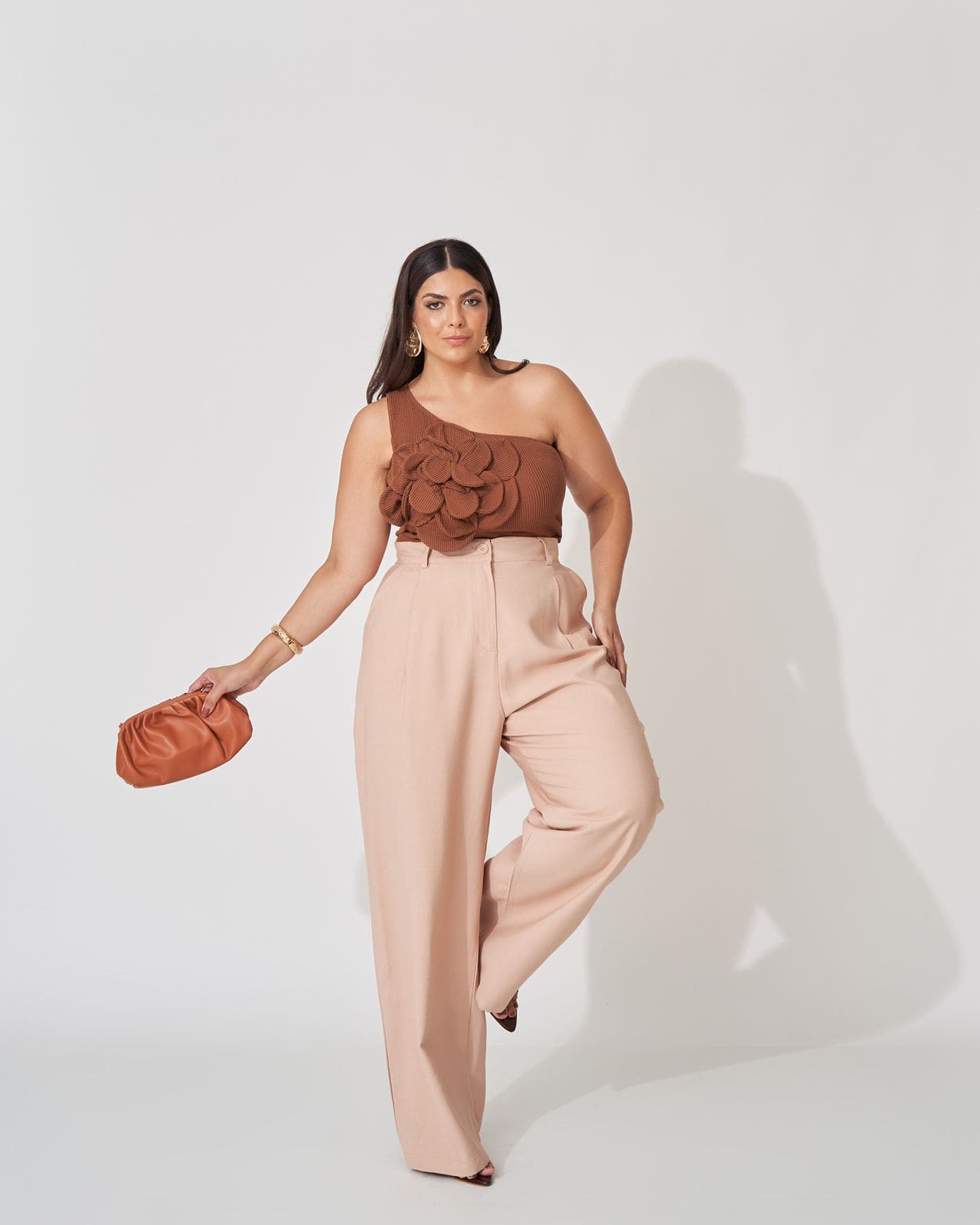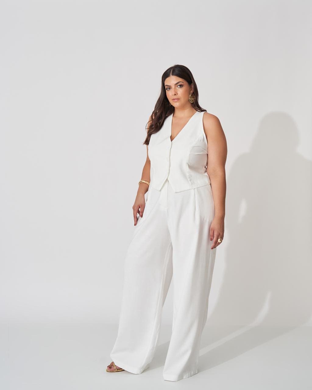 Corte pantalona: Pernas largas e caimento solto que proporciona movimento e leveza, criando uma silhueta alongada e sofisticada.