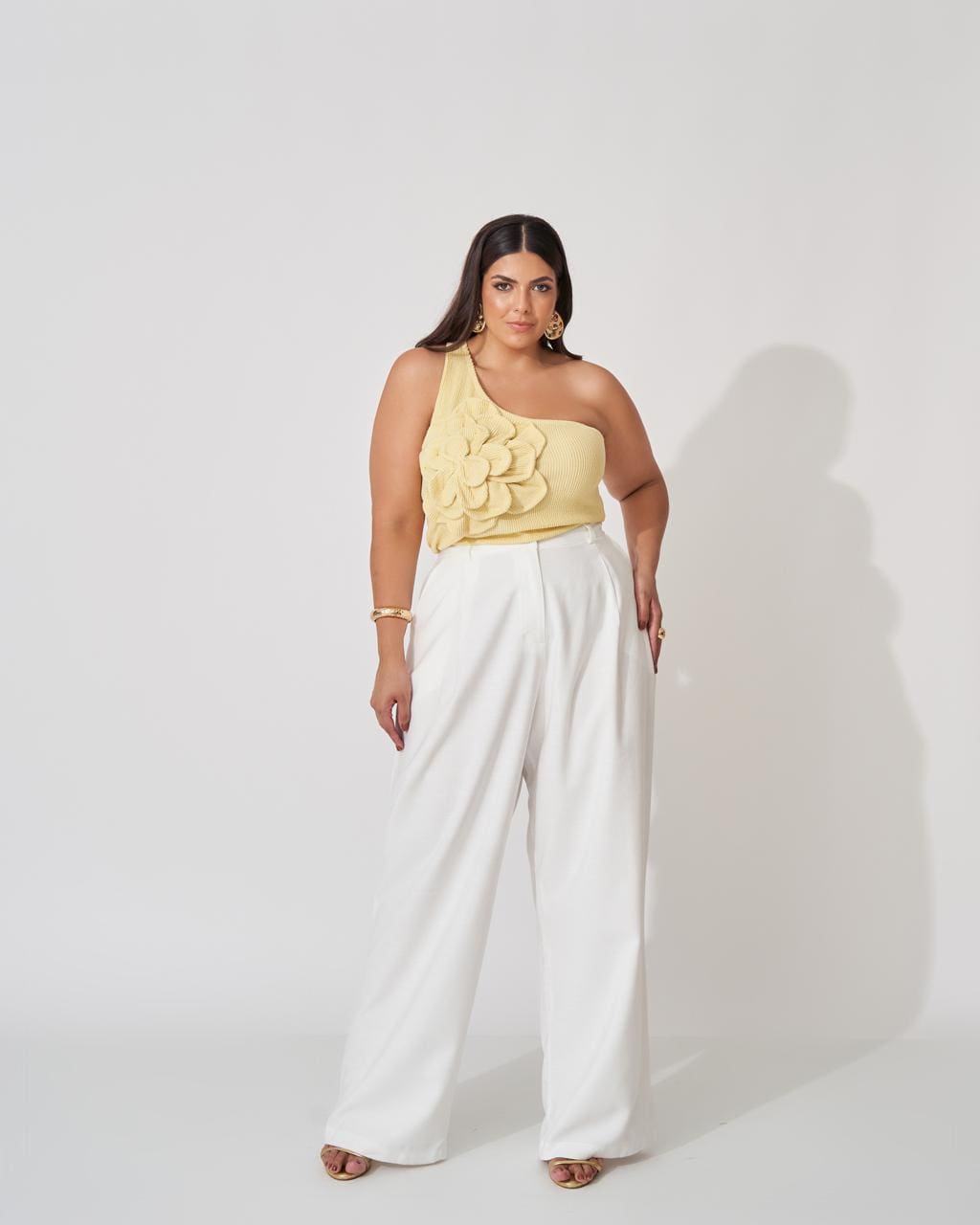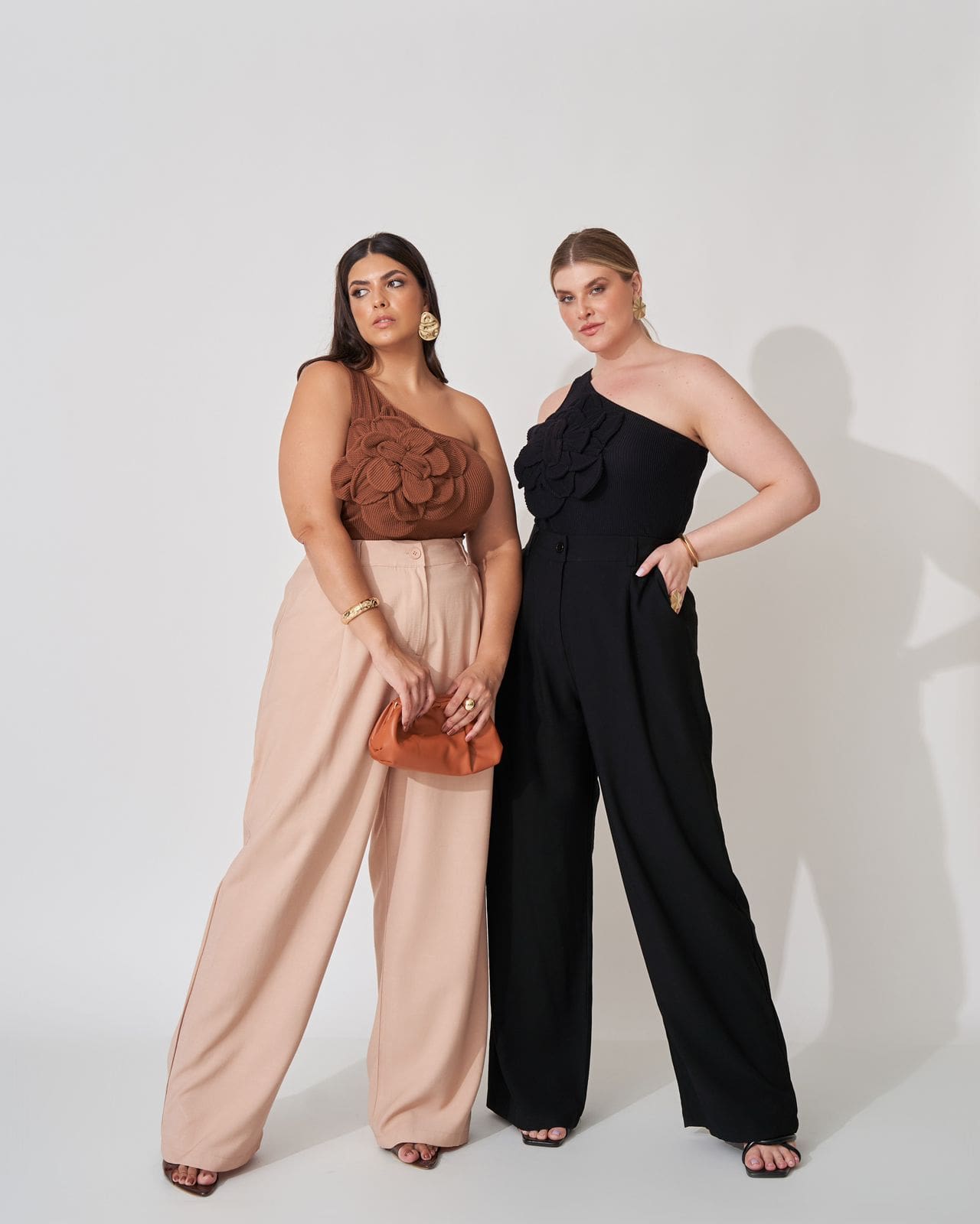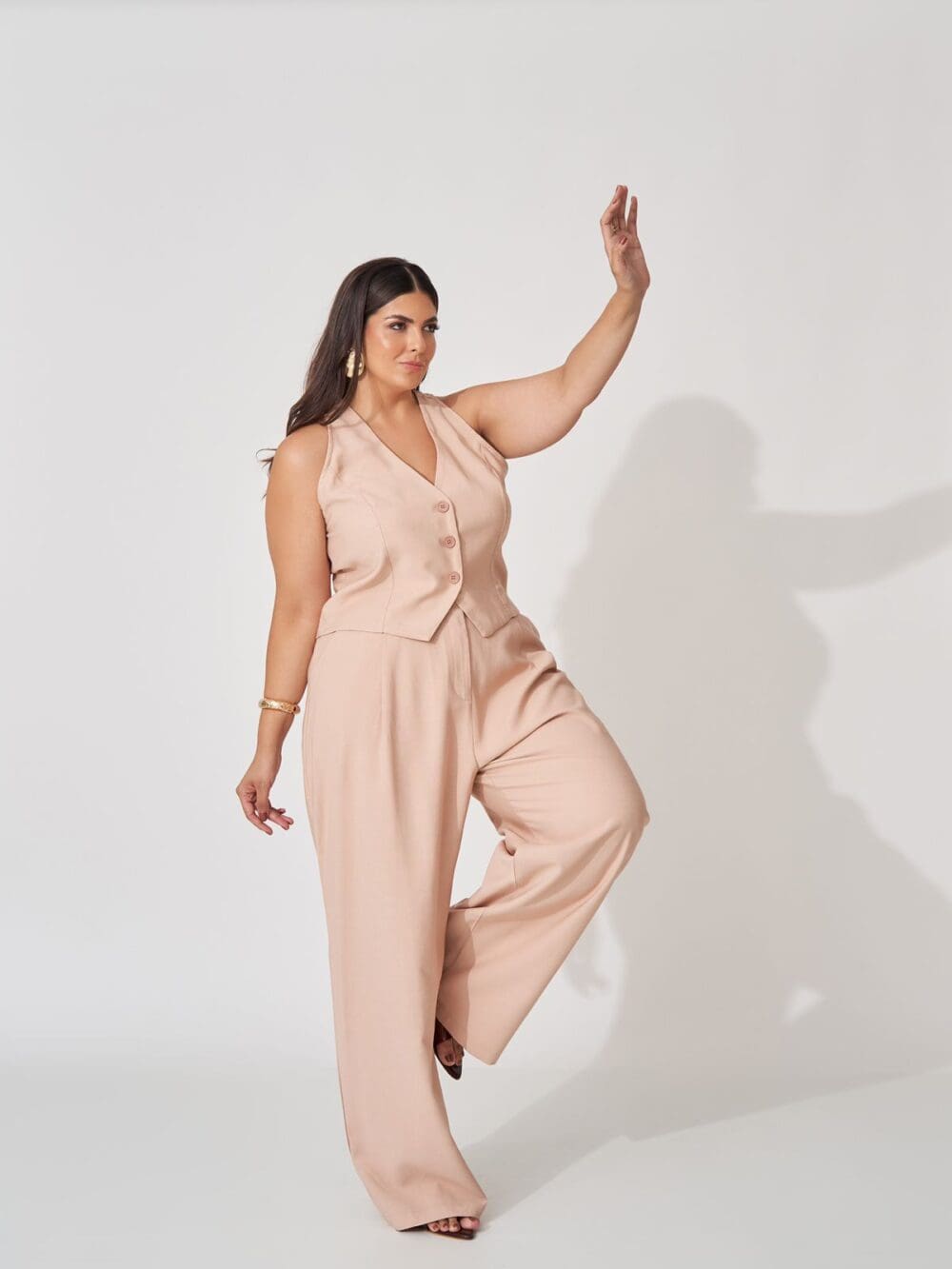 Corte pantalona: Pernas largas e caimento solto que proporciona movimento e leveza, criando uma silhueta alongada e sofisticada.