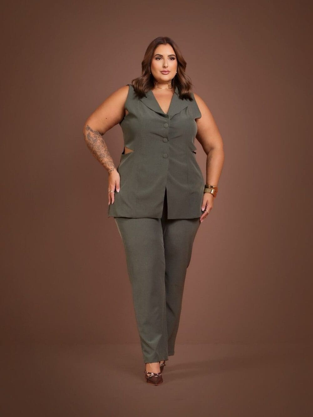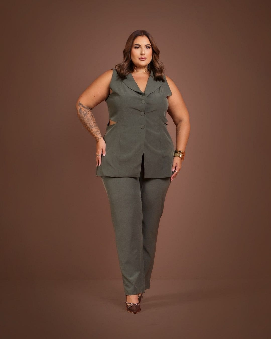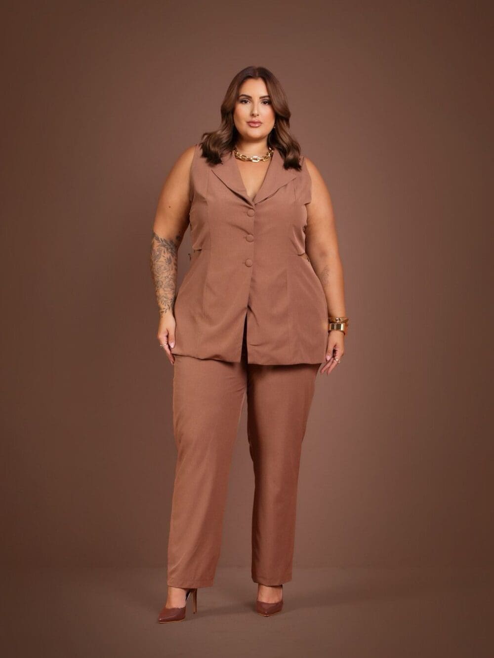 Conjunto elegante, composto por colete estruturado e calça de alfaiataria. O colete traz um design sofisticado com três botões frontais e uma sutil abertura na cintura, valorizando a silhueta com modernidade. A calça apresenta cós reto na frente, elástico na parte de trás para melhor ajuste e fechamento por zíper, garantindo conforto e praticidade. Confeccionado em tecido Espandix com elastano e forro interno, este conjunto une sofisticação e versatilidade, ideal para composições formais e casuais com um toque de moda.