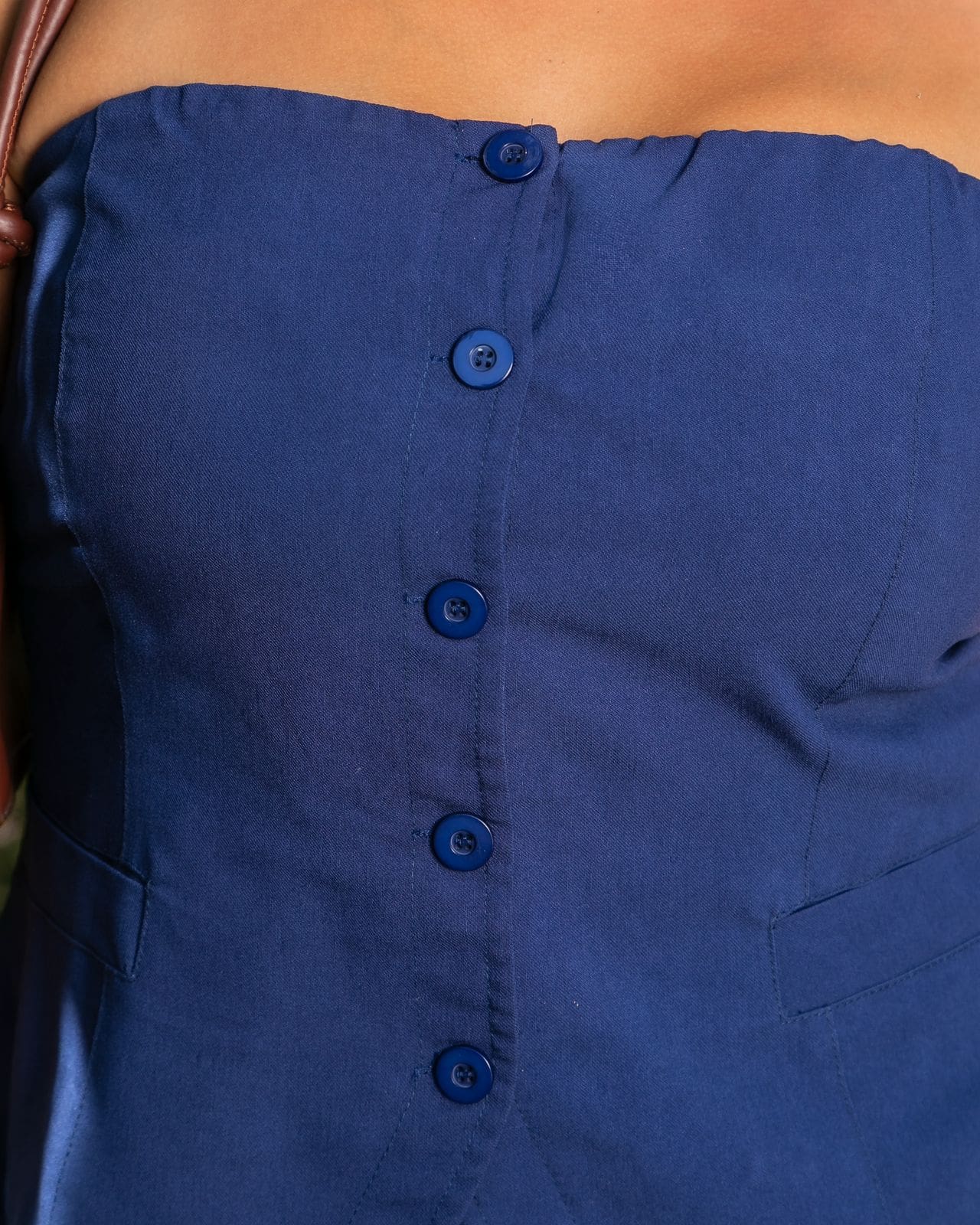 Um conjunto de saia com bolso frontal e blusa tomara que caia com botões na frente é a definição de elegância moderna e sofisticação! ✨