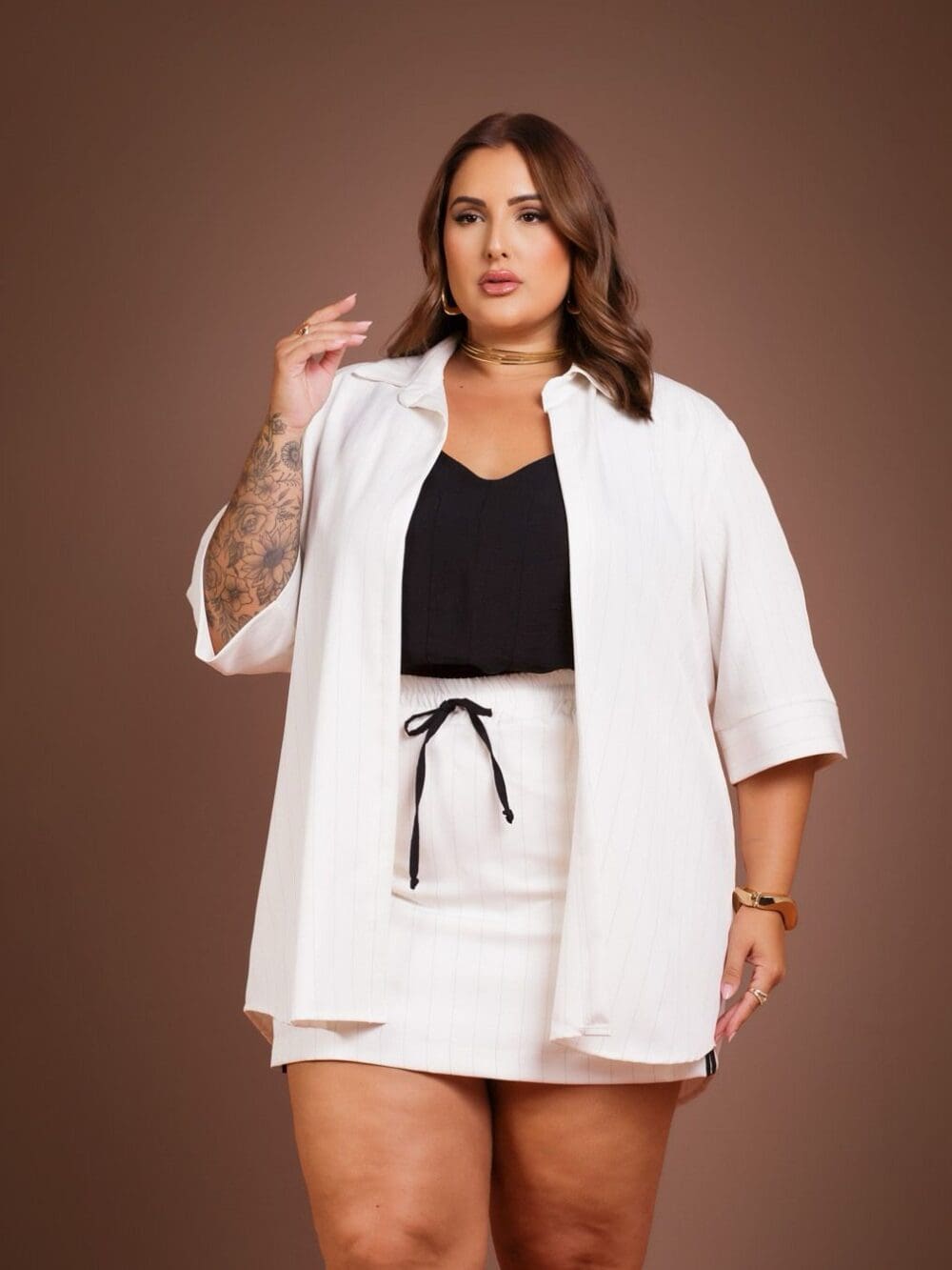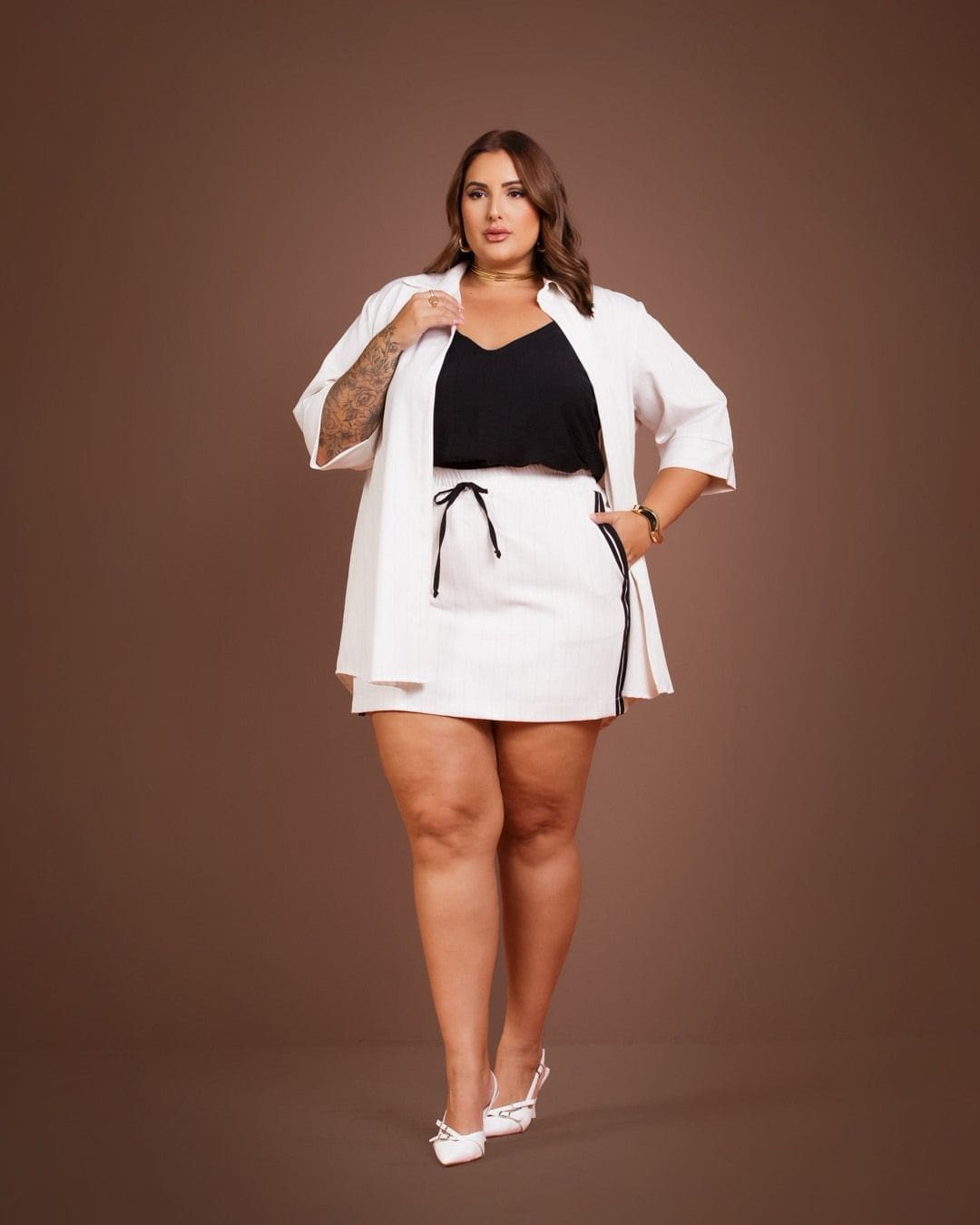 Conjunto elegante e atemporal composto por camisa over e saia, perfeito para quem busca sofisticação com um toque moderno. A camisa possui modelagem ampla, mangas 7/8 e fechamento por botões, proporcionando conforto e um caimento fluido. A saia apresenta cós reto na frente com elástico na parte traseira para melhor ajuste, além de listras laterais contrastantes que alongam a silhueta e reforçam o design contemporâneo.