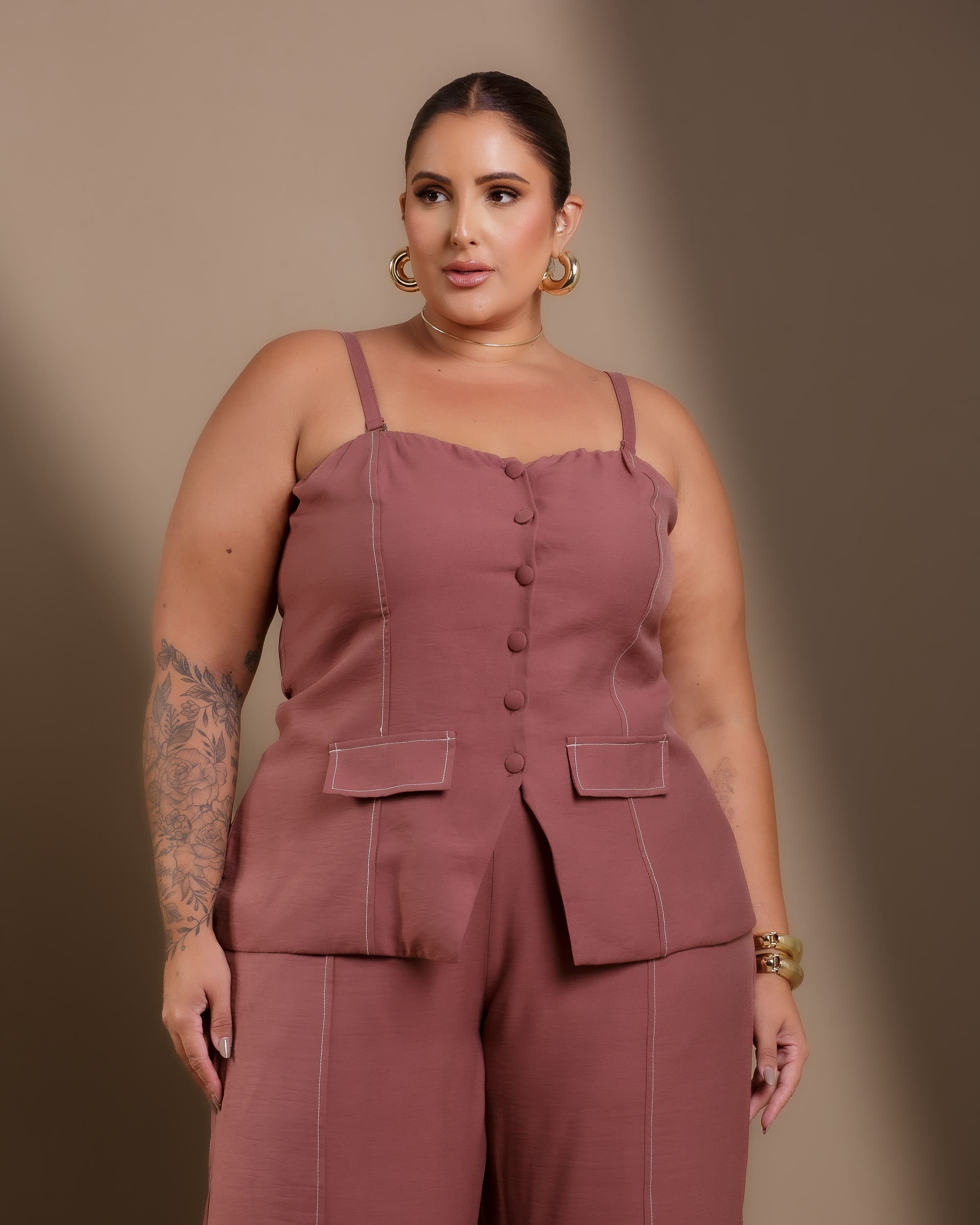 Conjunto Tomara que Caia e Calça une versatilidade e elegância em um design moderno e sofisticado. A blusa tomara que caia conta com alças removíveis para adaptação ao estilo desejado, além de lastex nas costas para ajuste perfeito e conforto. Os botões frontais e as lapelas adicionam um toque refinado ao visual. A calça reta, com cós elástico na parte de trás e fechamento por zíper, proporciona um caimento estruturado sem perder a flexibilidade. Confeccionado no tecido Sensoriale Sarjado, garante toque macio, durabilidade e excelente acabamento.