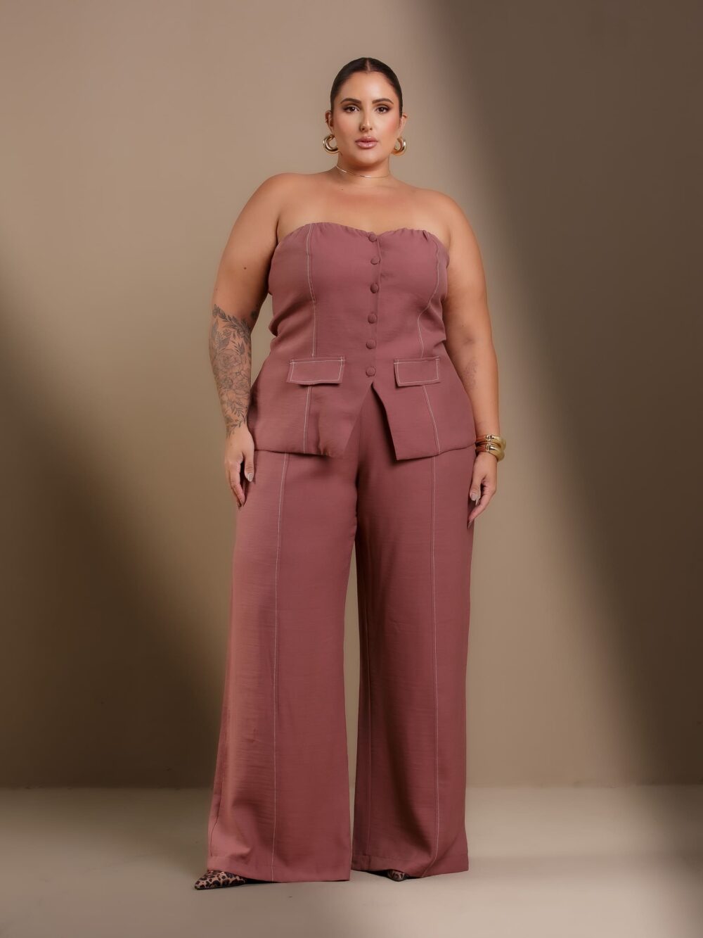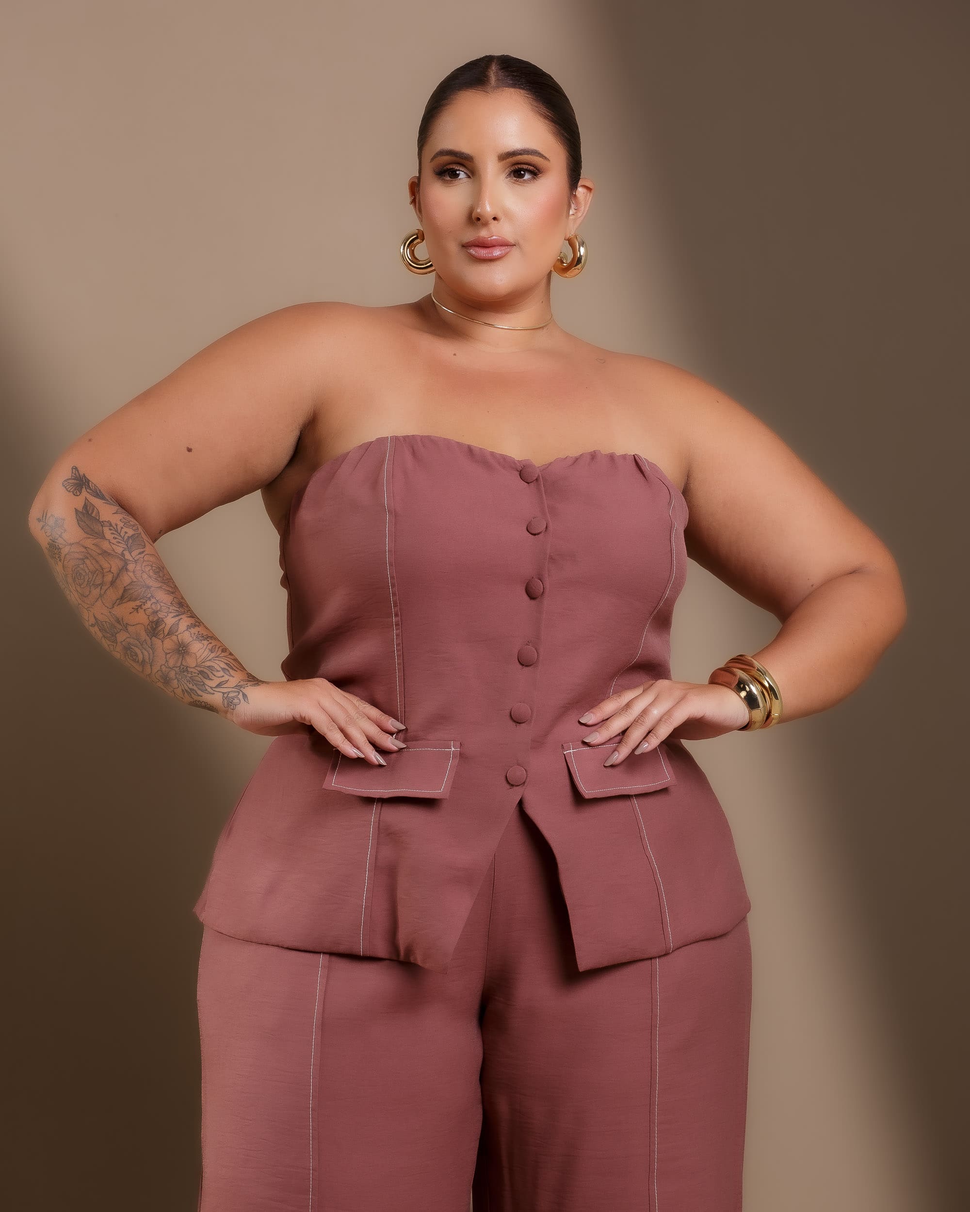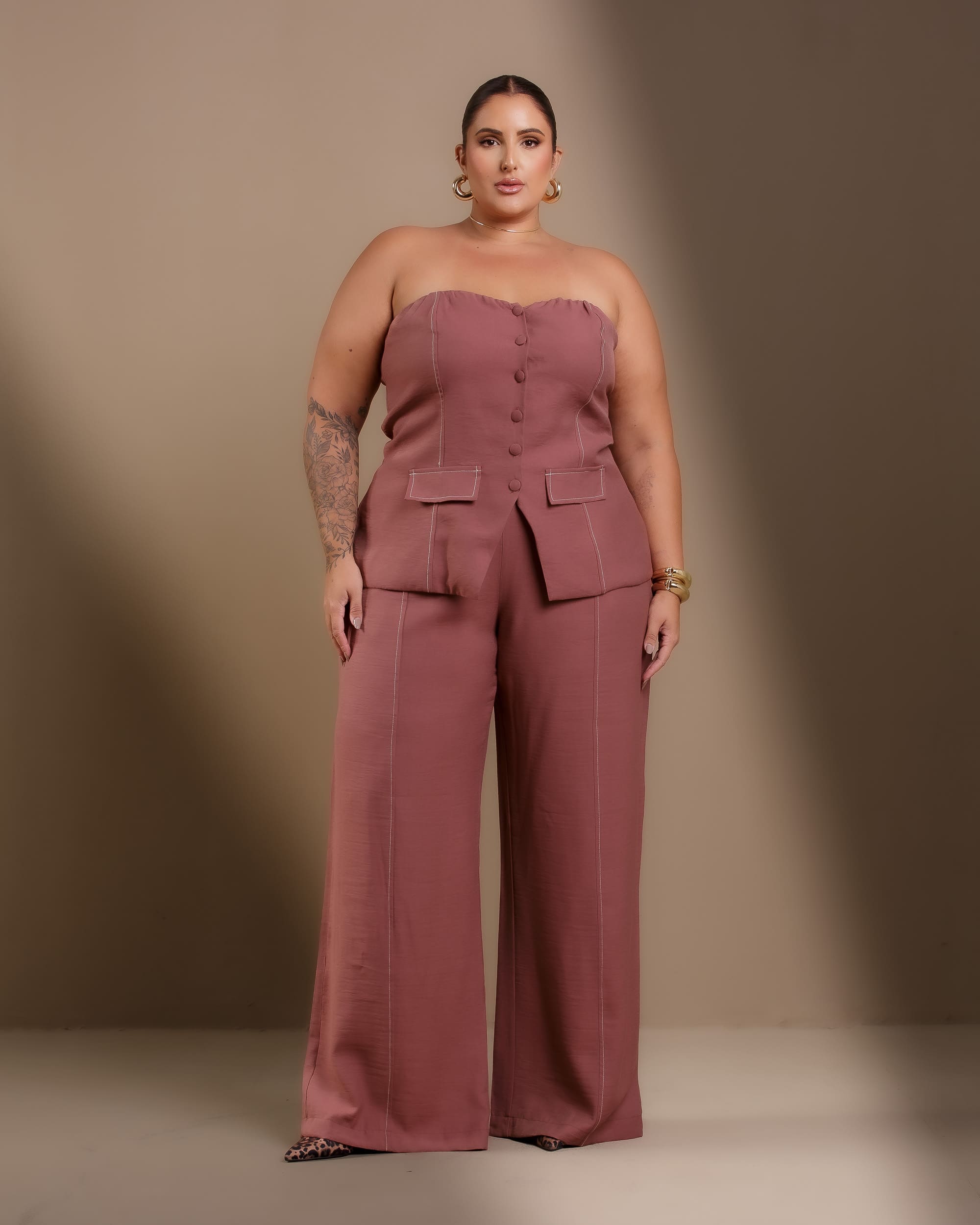 Conjunto Tomara que Caia e Calça une versatilidade e elegância em um design moderno e sofisticado. A blusa tomara que caia conta com alças removíveis para adaptação ao estilo desejado, além de lastex nas costas para ajuste perfeito e conforto. Os botões frontais e as lapelas adicionam um toque refinado ao visual. A calça reta, com cós elástico na parte de trás e fechamento por zíper, proporciona um caimento estruturado sem perder a flexibilidade. Confeccionado no tecido Sensoriale Sarjado, garante toque macio, durabilidade e excelente acabamento.