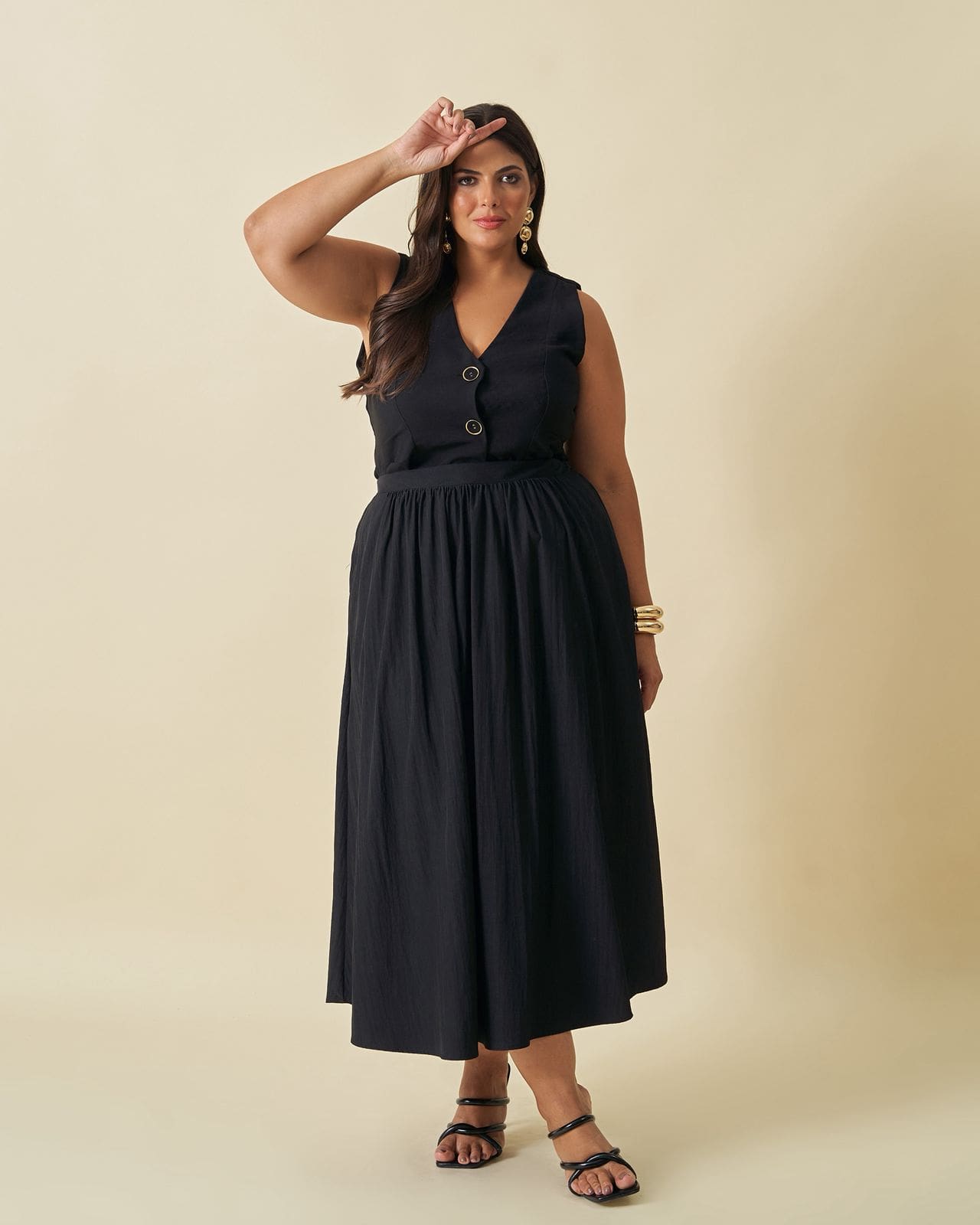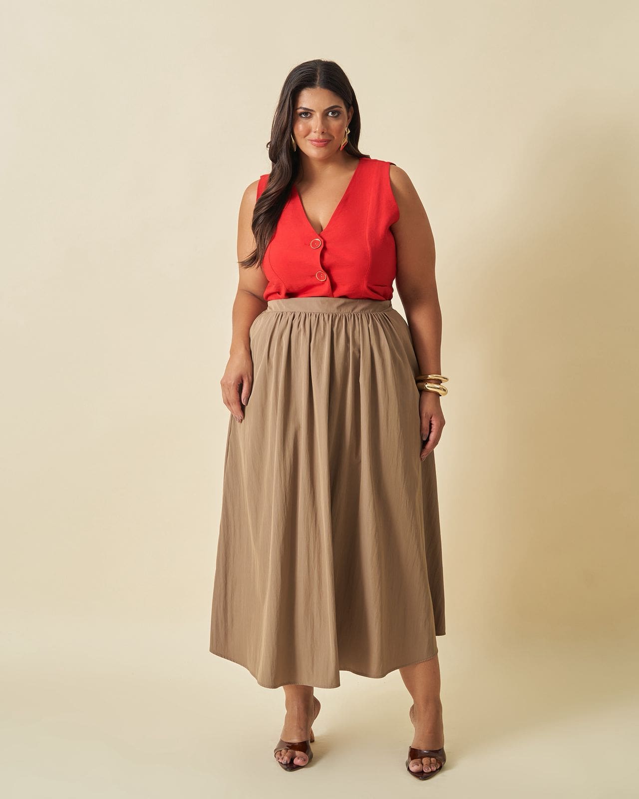 SAIA ALONGADA EM POLIÉSTER COM FRANZIDO NA FRENTE,CÓS LISO E ELÁSTICO