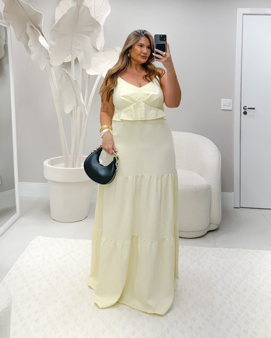 O vestido longo Três Marias com detalhe no busto é uma peça romântica, elegante e super versátil. O modelo Três Marias, com suas camadas franzidas na saia, proporciona movimento e leveza, enquanto o detalhe no busto pode valorizar o colo e trazer um toque especial ao look. .